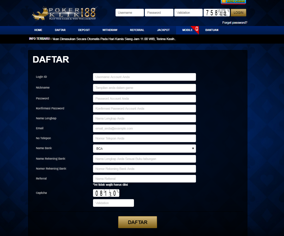 Anda yang sudah mengisi semua data-data Anda secara valid maka Anda sudah dapat langsung melakukan Login pada bagian atas dengan memasukan Login ID dan Password yang sudah Anda buat. Bila Anda sudah berhasil melakukan login maka Anda dapat langsung melakukan deposit dengan menghubungi customer kami via LiveChat Pokerklik188